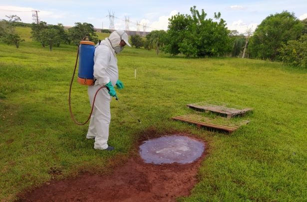 Na Itaipu, a aplicação do larvicida é feita em poças difíceis de serem drenadas. Ao fundo, barragem. Foto: ODMS.CD