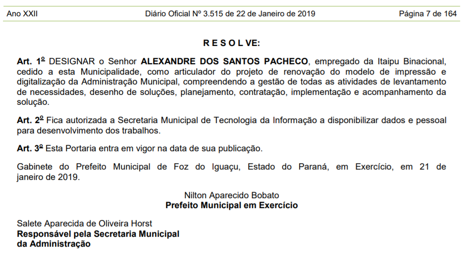 O empregado em questão é Alexandre dos Santos Pacheco que deverá, segundo resolução publicada ontem (22) no Diário Oficial do Município (DOM), trabalhar “como articulador do projeto de renovação do modelo de impressão e digitalização da Administração Municipal, compreendendo a gestão de todas as atividades de levantamento de necessidades, desenho de soluções, planejamento, contratação, implementação e acompanhamento da solução“.