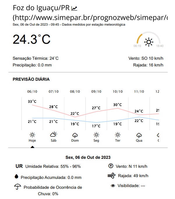 Esta sexta-feira deve ser ensolarada em Foz do Iguaçu, com muito calor: máxima de 33 graus.