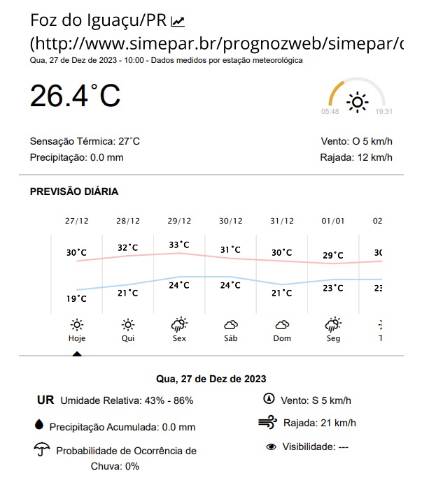 - Foz do Iguaçu: temperatura máxima registrada, às 15 horas, foi de e 28,8 graus, com sensação térmica de 28 graus;