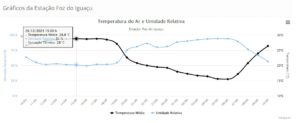 - Foz do Iguaçu: temperatura máxima registrada, às 15 horas, foi de e 28,8 graus, com sensação térmica de 28 graus;