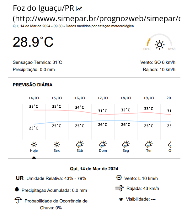 Quinta-feira com tempo ensolarado em Foz do Iguaçu e de muito calor, que chegará ao ápice por volta das 15 às 17 horas, com temperaturas de 35 graus.