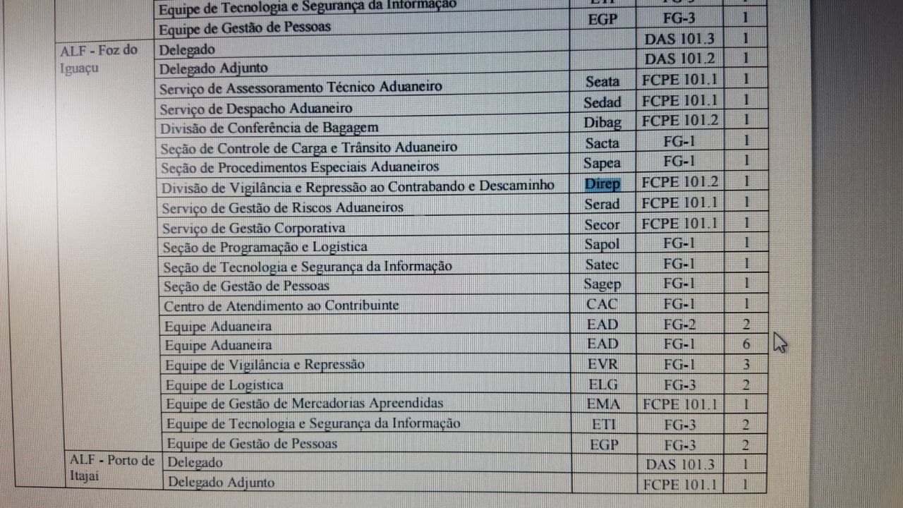 Na foto acima, do Diário Oficial de hoje, obtida com exclusividade pelo blog, dá pra se ver, no canto superior esquerdo, a abreviação da palavra alfândega ao lado de todos os departamentos que compõem o órgão em Foz do Iguaçu.