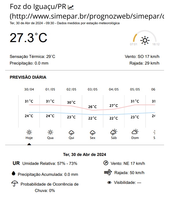 Ontem, vale ressaltar, a sensação térmica chegou a 37 graus em Foz do Iguaçu no período da tarde, segundo dados registrados na estação meteorológica do Simepar no município.