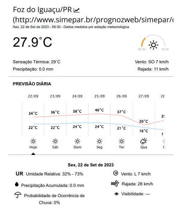 A título de comparação, ontem (21), a temperatura máxima foi de 38,2 graus, às 16 horas, segundo foi registrado na estação meteorológica do Simepar em Foz.