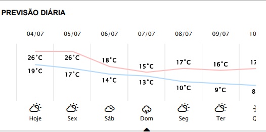 A partir de sábado, as temperaturas começam a cair e as máximas devem ficar na faixa dos 17 graus e as mínimas abaixo dos 10 graus.