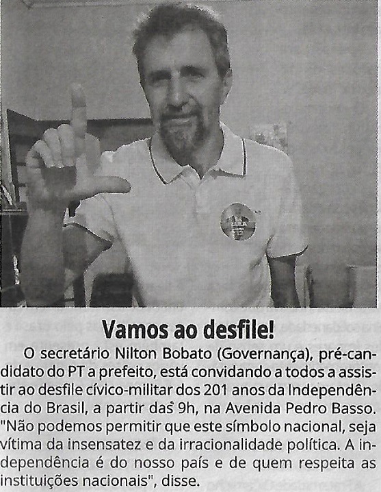 Vale ressaltar que, também ontem, o secretário de Governança da Prefeitura de Foz do Iguaçu, o petista Nilton Bobato, convocou a população para assistir ao desfile, segundo foi publicado na coluna Palavra Livre, do jornal GDia, conforme foto abaixo.