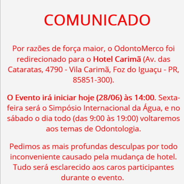 A organização da Odontomerco 2018, via Facebook, disse que “lamenta os vários relatos de insatisfação descritos dentro e fora das redes sociais. informamos que as dificuldades que estamos passando foram por complicações com cumprimento de contratos e serviços que geraram toda esta situação e transtornos a todos os envolvidos”.