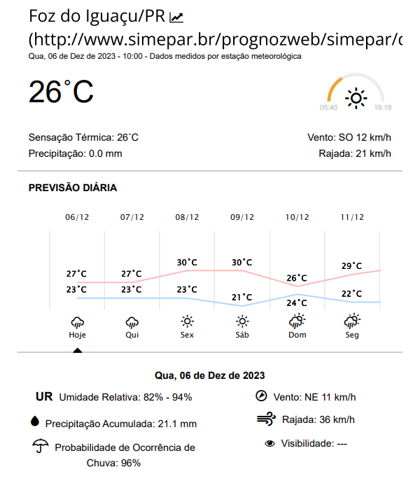 Quarta-feira (06) chuvosa em Foz do Iguaçu,  com máxima prevista de 27 graus.