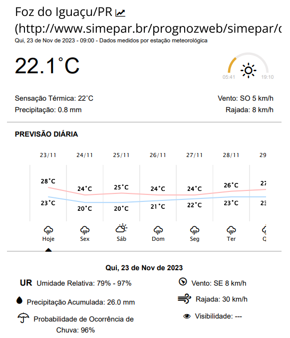 Segundo o Simepar, esta quinta-feira (23) deve ser bastante chuvosa em Foz do Iguaçu, com máxima de 28 graus.