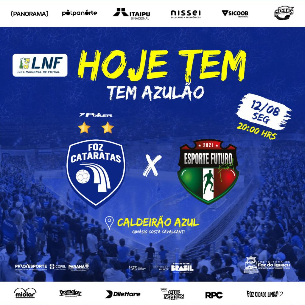 O Foz Cataratas Poker Futsal encara o Esporte Futuro, pela 19ª rodada da Liga Nacional de Futsal, nesta segunda-feira, 12 de agosto, às 20 horas, no Ginásio Costa Cavalcanti, o Caldeirão Azul. A partida será transmitida online pela LNFTV, no seu canal no Youtube.