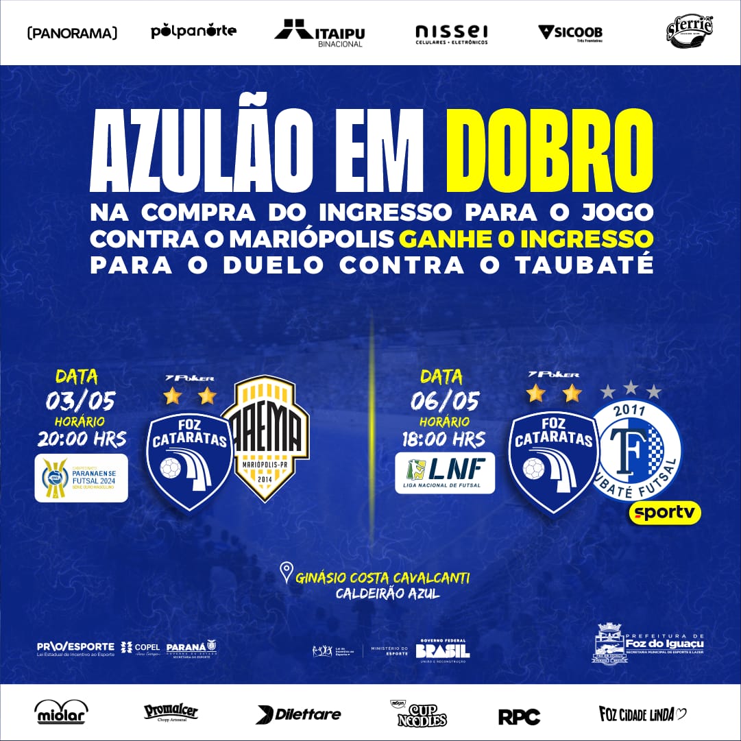 O Azulão das 3 Fronteiras enfrenta o Mariópolis nesta na sexta-feira, 3, às 20 horas. O torcedor que adquirir o ingresso para a partida do Mariópolis tem acesso livre para assistir ao Foz contra o Taubaté. O valor antecipado do combo para as duas partidas é de 25 reais.