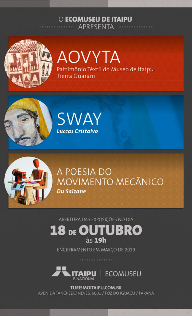 Ao todo, são quase 80 peças entre esculturas, telas, teares e tecidos nas três mostras: A Poesia do Movimento Mecânico, de Du Salzane; Sway Luccas Cristalvo, do jovem artista plástico homônimo; e Aovyta, de propriedade do Museo de Itaipu Tierra Guarani, mantido pelo lado paraguaio da Itaipu, e emprestadas ao Ecomuseu para a exposição.