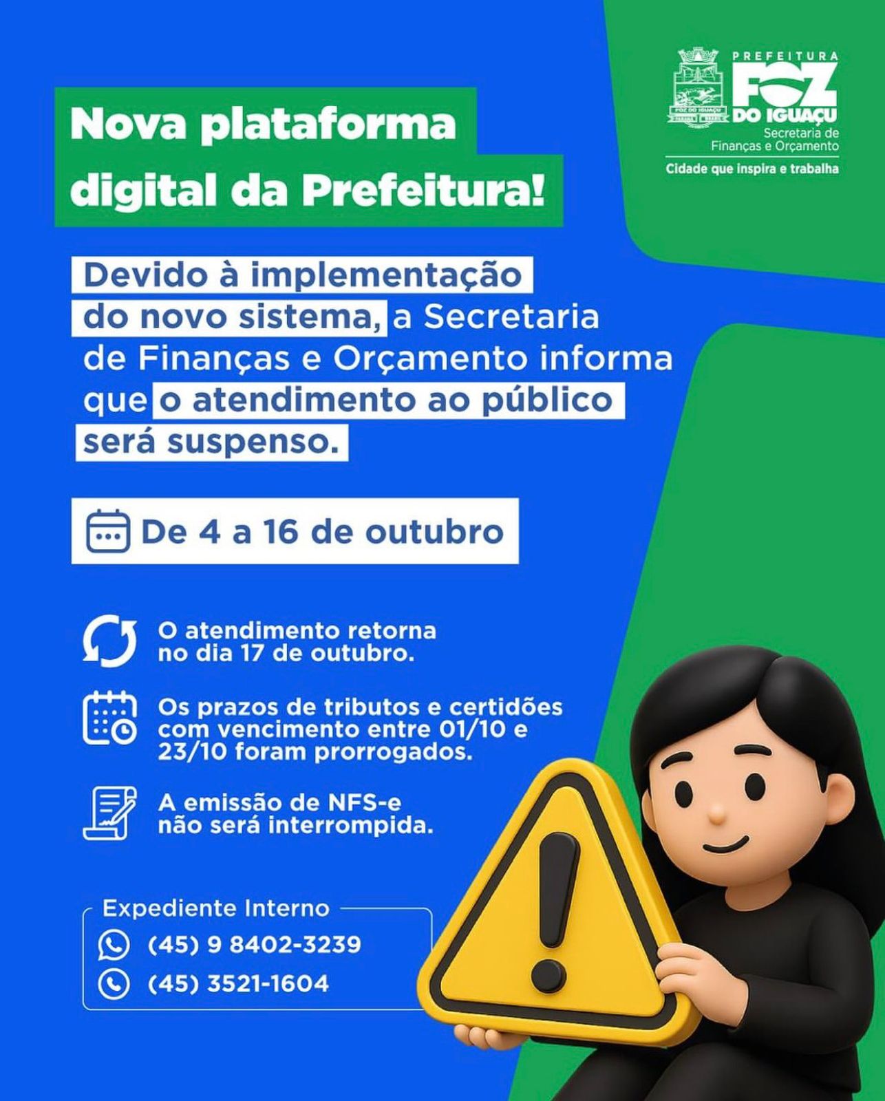 A Prefeitura de Foz do Iguaçu informa que o módulo de Nota Fiscal de Serviços Eletrônica (NFS-e) da nova Plataforma Integrada de Gestão entrará em operação a partir das 00h01 de sábado (04).