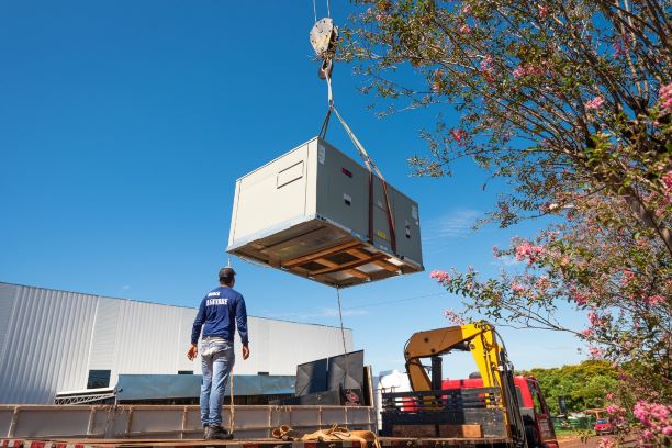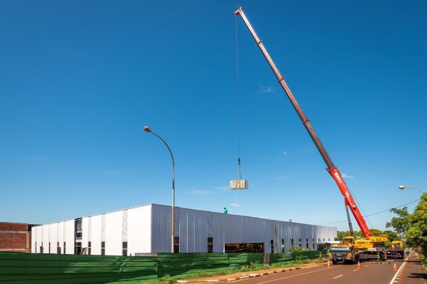 Na manhã desta quinta-feira (14), um guindaste com capacidade para cem toneladas foi usado para posicionar três aparelhos de ar condicionado sobre o teto da estrutura.