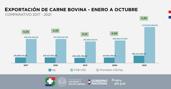 O Paraguai exportou mais de 283 milhões de toneladas de carne bovina, de janeiro a outubro de 2021, estabelecendo um novo recorde para o setor, cujo valor atingiu 1,38 bilhão de dólares, segundo dados divulgados pelo Serviço Nacional de Qualidade e Saúde Animal (Senacsa).