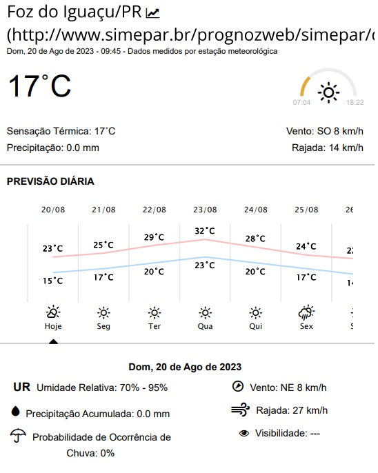 Previsão do Simepar diz que este domingo (20), Dia do Maçom, será de sol entre nuvens em Foz do Iguaçu, com máxima de 23 graus, mas sem previsão de chuva.