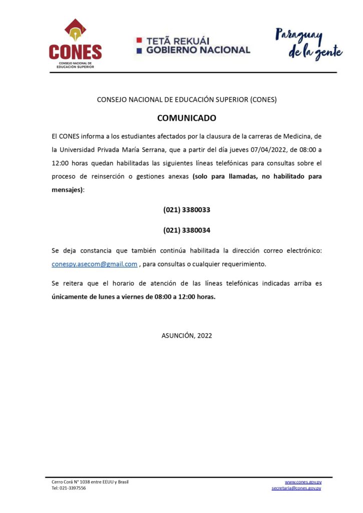 Ainda ontem, o Conselho Nacional de Educação Superior do Paraguai (CONES), colocou à disposição desses estudantes os telefones (021) 3380033 e (21) 3380034, de segunda a sexta-feira, no horário das 8 às 12 horas, conforme mostra ofício abaixo, para esclarecer essas dúvidas.