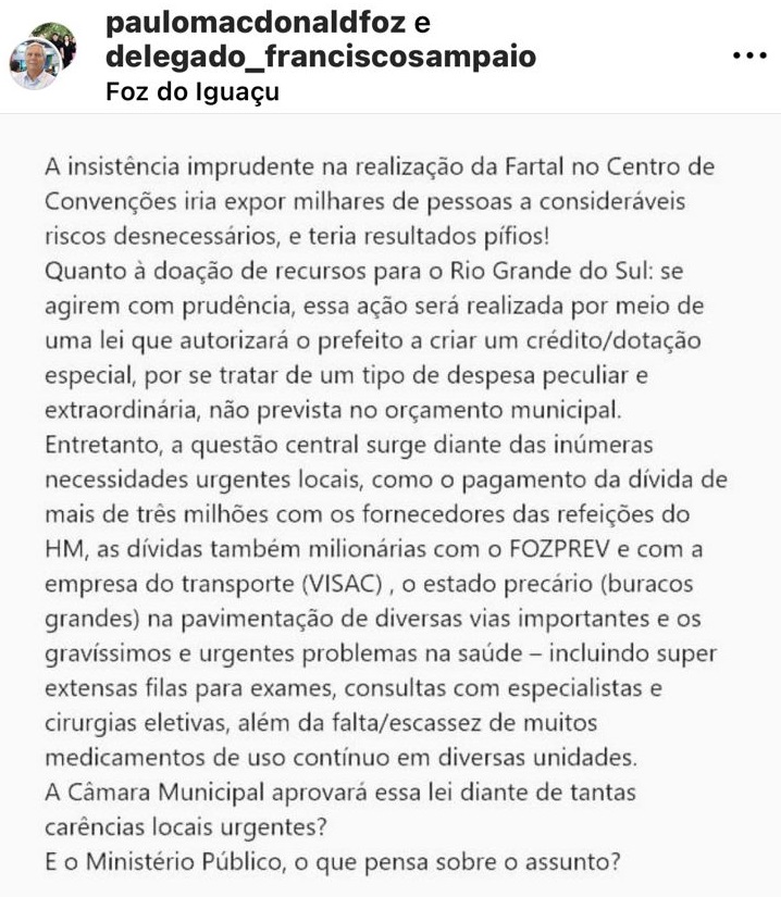 O ex-prefeito de Foz do Iguaçu Paulo Mac Donald Ghisi, que teve o seu direito de disputar a eleição para prefeito do município restaurado ontem (vejam AQUI), e o atual vice-prefeito do município, Delegado Francisco Sampaio, questionaram a decisão de cancelar a Fartal deste ano, para enviar o dinheiro dos shows, R$ 1 milhão, para as vítimas das enchentes do Rio Grande do Sul.