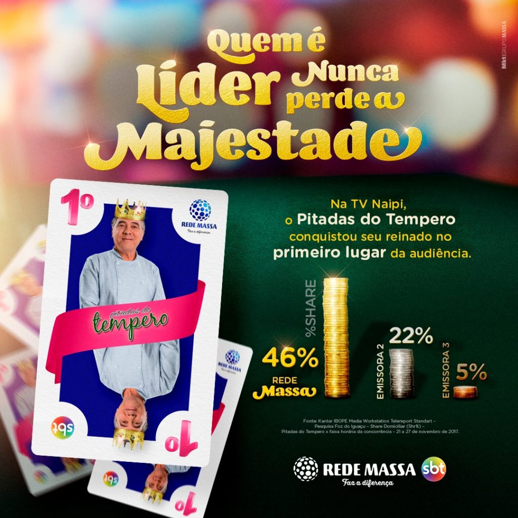 Resultado: os bons índices de audiência levaram a tevê do Ratinho a preparar uma ampla campanha publicitária, sob o título “Quem é líder, nunca perde a majestade”, para comemorar a liderança – à qual o Não Viu? teve acesso.