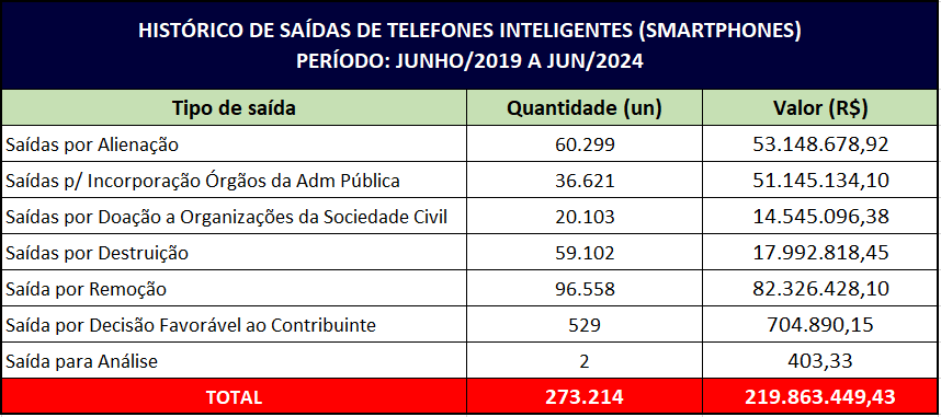 No período, foram apreendidos 273.214 aparelhos, cujo valor chegou a mais de R$ 219,8 milhões