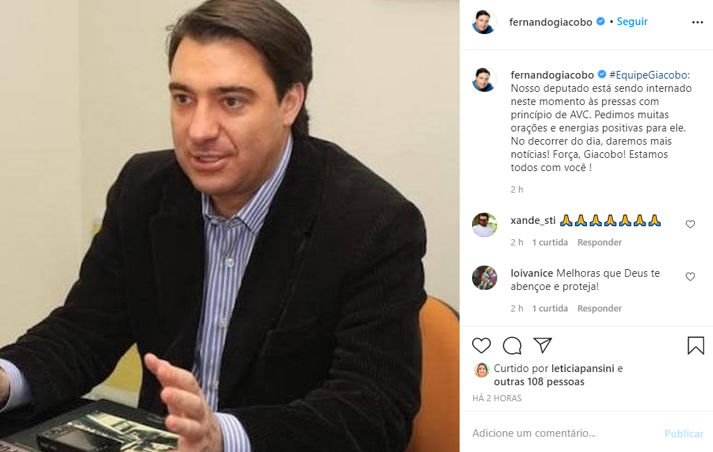 O deputado federal Fernando Giacobo acaba de ser internado com princípio de AVC, informa a sua equipe em nota publicada no instagram, conforme reprodução publicada acima.