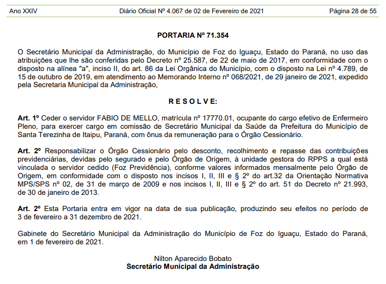 Segundo portaria do secretário de Administração, Nilton Bobato, publicada ontem (02), no Diário Oficial do Município, o enfermeiro Fabio Mello, funcionário de carreira da Prefeitura Municipal de Foz do Iguaçu, foi cedido para ocupar o cargo de secretário de Saúde do município de Santa Terezinha de Itaipu.