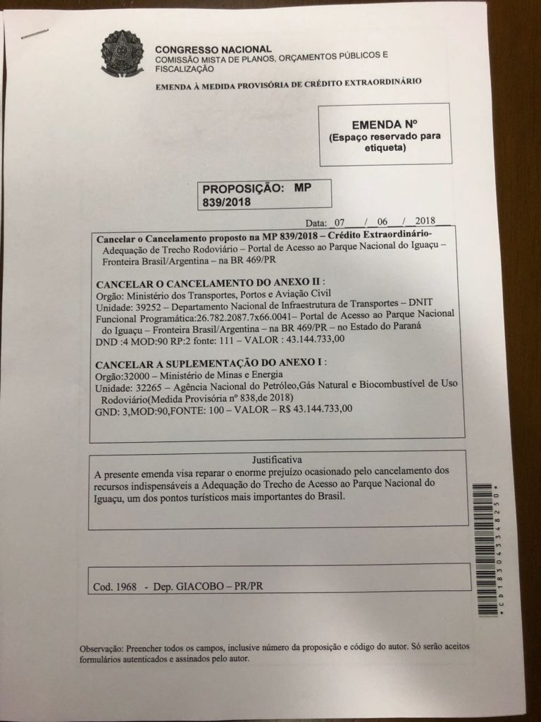 Caros leitores, vocês já ouviram falar de emenda supressiva? Poucos de nós ouvimos, mas essa é artimanha que o deputado federal Fernando Giacobo está usando para tentar recuperar a verba destinada à duplicação da Rodovia das Cataratas, a BR-469, que foi cortada pelo governo Temer.
