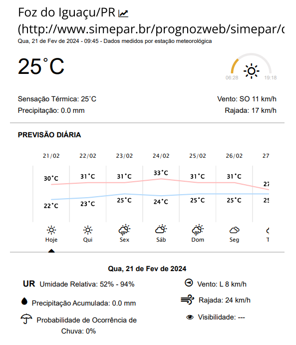Quarta-feira (21) ensolarada em Foz do Iguaçu, com mínima de 22 e máxima de 30 graus.