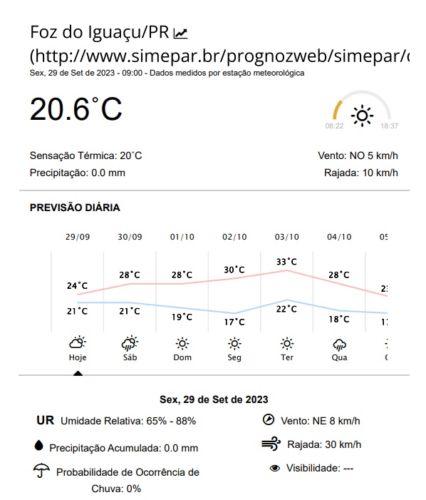 Sexta-feira (29) com céu parcialmente nublado e máxima de 24 graus em Foz do Iguaçu