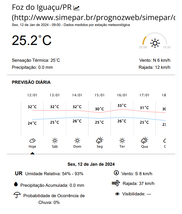 Sexta-feira com céu parcialmente nublado em Foz do Iguaçu e temperaturas entre 24 e 32 graus.