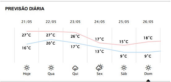 Segundo a previsão do Simepar, as temperaturas máximas vão ficar na casa dos 27 graus até quinta-feira, 23 de maio.