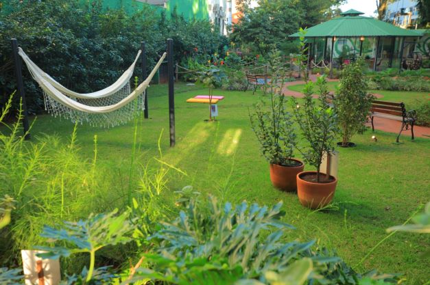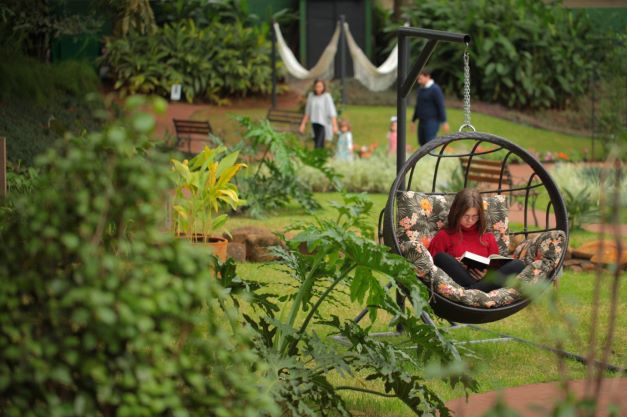 Além disso, quem visitar o Jardim da Oma poderá fazer curtas caminhadas entre os canteiros, descansar nas redes, bancos e balanços ou usar colchonetes para se sentar na grama.