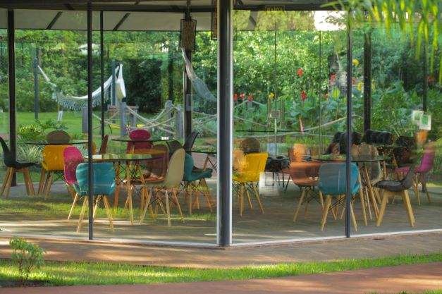 Bem no centro do jardim, um quiosque com paredes de vidro, climatizado, pode ser usado para reuniões de trabalho e confraternizações.