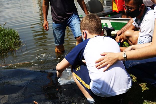 Alunos da AFA participaram da soltura dos lambaris. Foto: PMFI/divulgação
