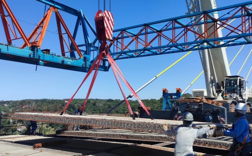 Neste fim de semana, as lajes pré-fabricadas de concreto foram colocadas na aduela central que liga as duas margens da Ponte da Integração sobre o Rio Paraná, que irá ligar Foz do Iguaçu, no Brasil, e Presidente Franco, no Paraguai.
