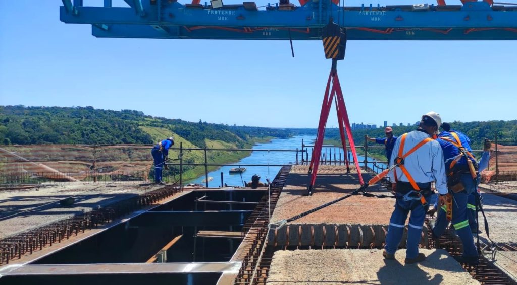 Neste fim de semana, as lajes pré-fabricadas de concreto foram colocadas na aduela central que liga as duas margens da Ponte da Integração sobre o Rio Paraná, que irá ligar Foz do Iguaçu, no Brasil, e Presidente Franco, no Paraguai.