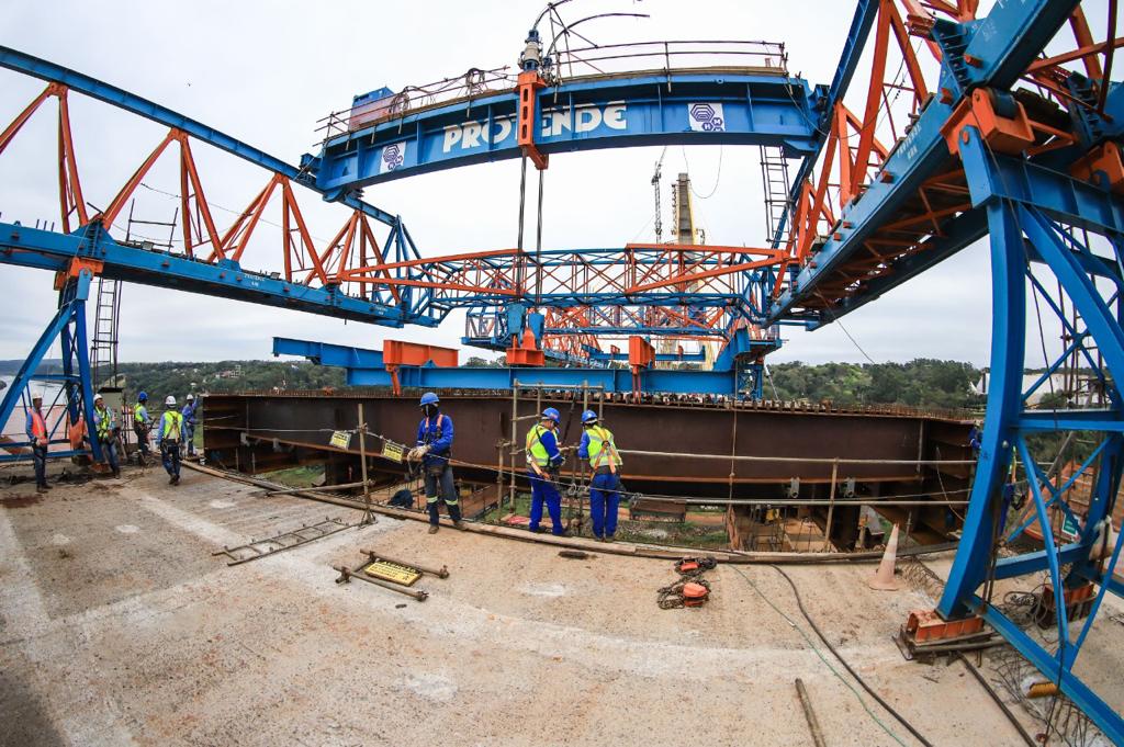 Essa última aduela (uma peça metálica da estrutura da ponte) levou 51 dias até ser concluída e ter todos os ensaios aprovados no canteiro brasileiro. O trabalho teve início no dia 9 de junho e terminou no dia 29 de julho. A partir de agora será realizado o processo de concretagem.