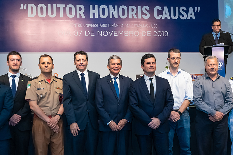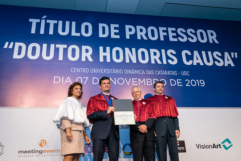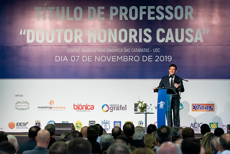 No evento, Moro recebeu o título de “Professor Doutor Honoris Causa” do Centro Universitário Dinâmica das Cataratas (UDC), honraria endossada por 32 instituições e oito empresas da região, entre elas a Itaipu Binacional.