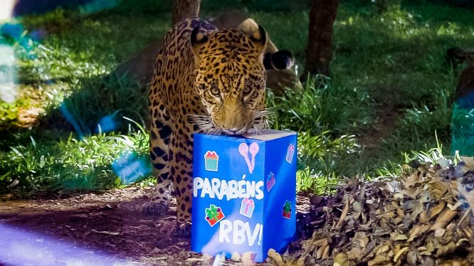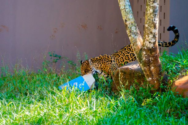 Onça recebe presente no aniversário do Refúgio Biológico da Itaipu. Fotos: Alexandre Marchetti/Itaipu Binacional