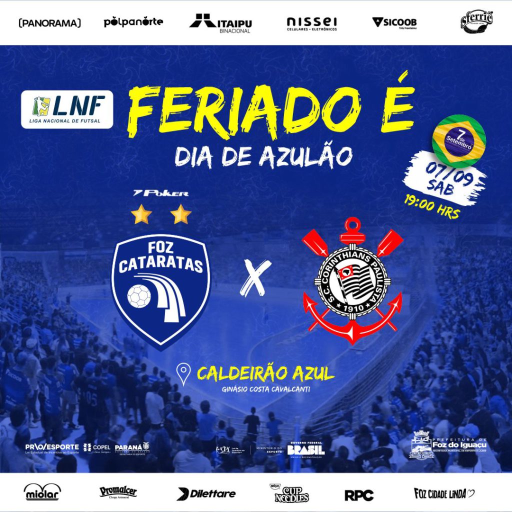 O Foz Cataratas Poker Futsal encara o Corinthians neste sábado, 7 de setembro, às 19 horas, no Ginásio Costa Cavalcanti, o Caldeirão Azul. A partida será transmitida pelo canal de televisão Band Sports e LNFTV, canal online da Liga no YouTube.