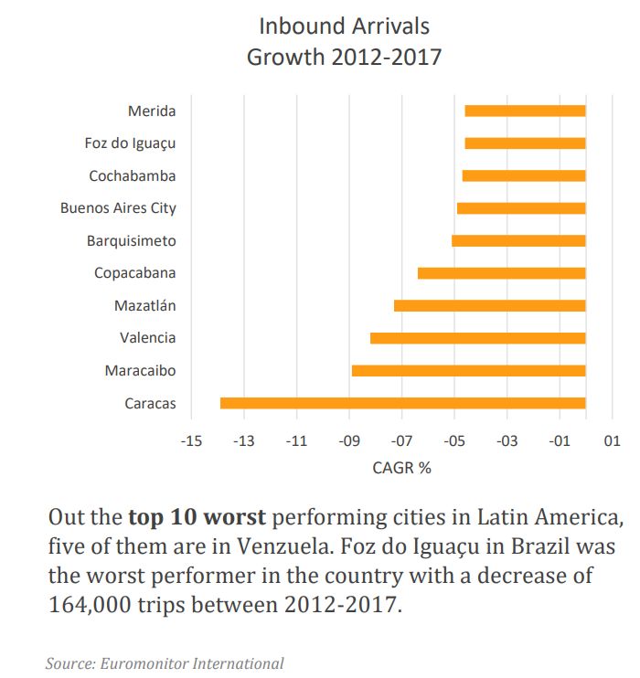 Aliás, a a Venezuela emplacou quatro cidades entre as com pior desempenho no turismo internacional.