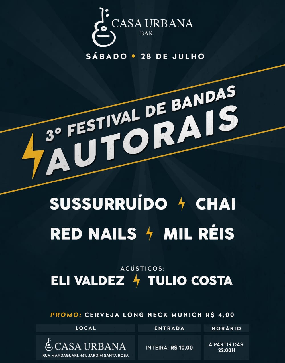 Neste sábado (28), a Casa Urbana recebe a 3ª edição do Festival de Bandas Autorais. Só gente boa!