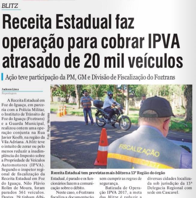 Vale a pena lembrar o que foi publicado no dia 23, quinta-feira, pelo jornal Gazeta Diário sobre a inadimplência do pagamento do IPVA em Foz do Iguaçu.