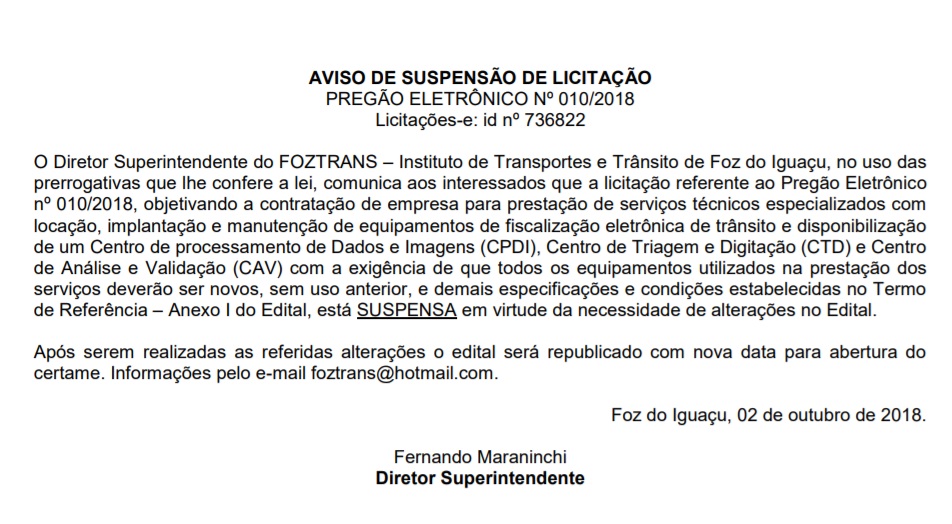 Por sugestão do Tribunal de Contas do Estado do Paraná, o Foztrans suspendeu a licitação para a instalação de novos radares de fiscalização de sinais de trânsito e de velocidade, os chamados pardais.