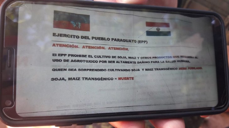 Na fazenda onde foi assassinado o brasileiro, foi encontrado um folheto do EPP com o alerta de que os guerrilheiros proíbem o cultivo de soja, milho e outros produtos com uso de agrotóxicos.