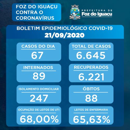 A Vigilância Epidemiológica de Foz do Iguaçu confirma na data de hoje, 21/09/2020, 67 casos de COVID-19, totalizando 6.645 casos da doença no município. Deste total, 6.221 pessoas já estão recuperadas.
