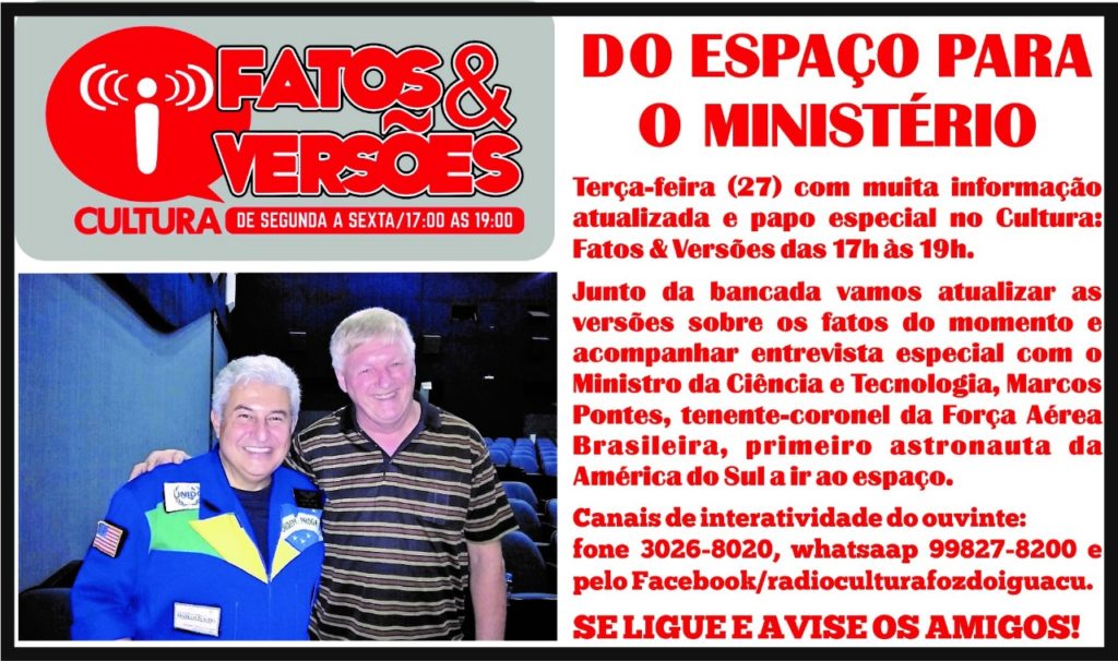 Hoje (27), o programa Cultura: Fatos & Versões traz uma entrevista especial com o futuro ministro da Ciência Tecnologia, Marcos Pontes.