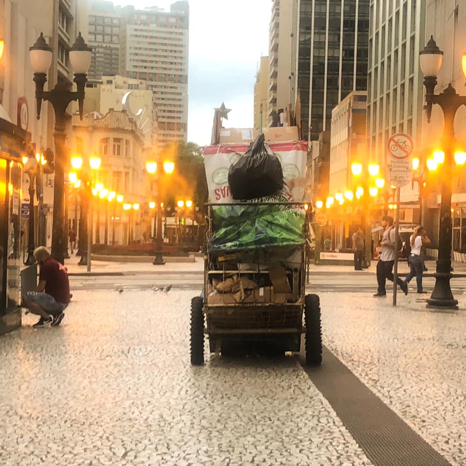 Na paisagem bem acabada, o homem que arrasta o carrinho em que cata o lixo dos cidadãos de melhor sorte.