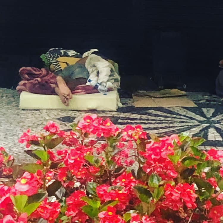 O mendigo, na porta da loja que ainda não abriu para os clientes de classe média.